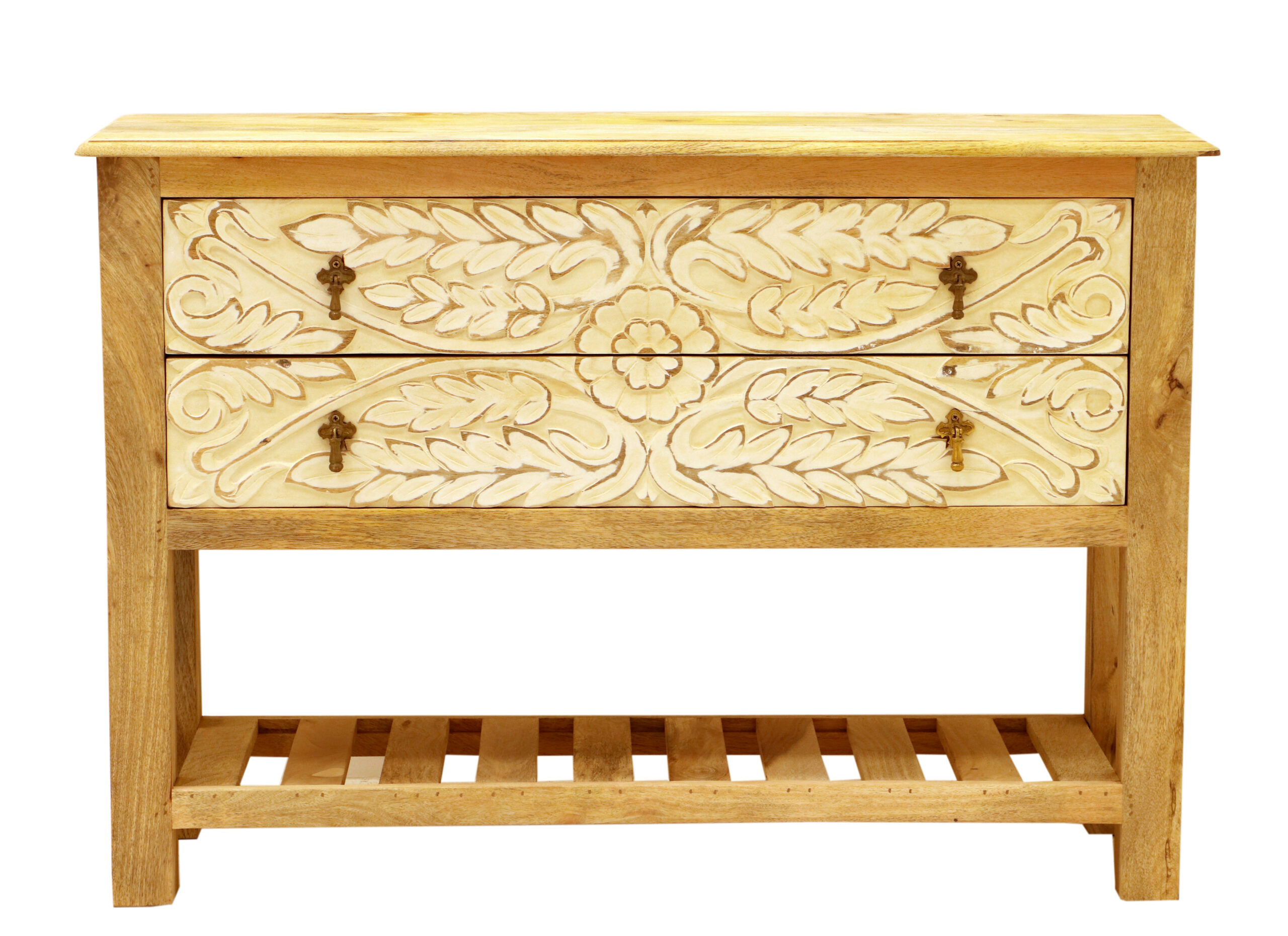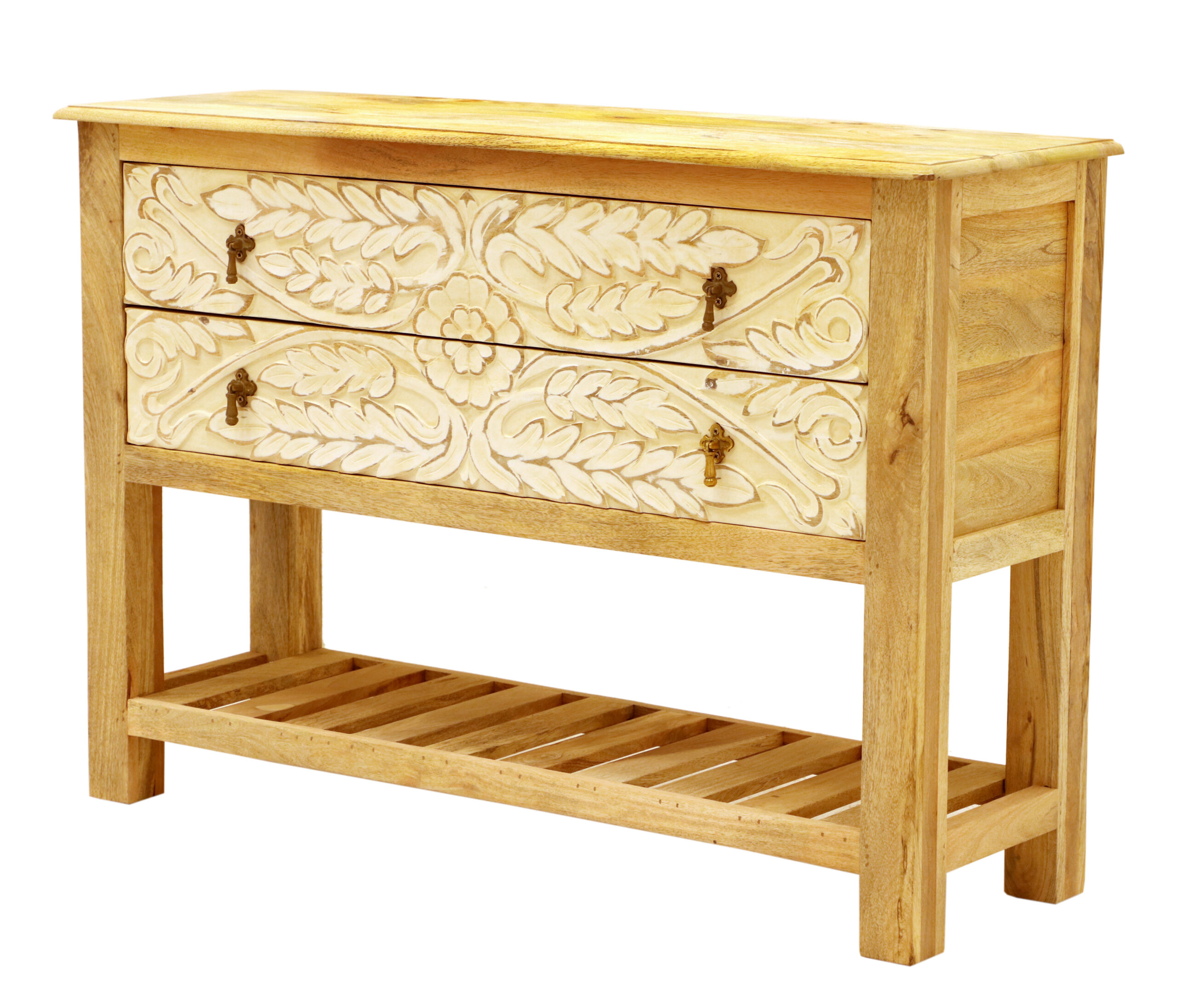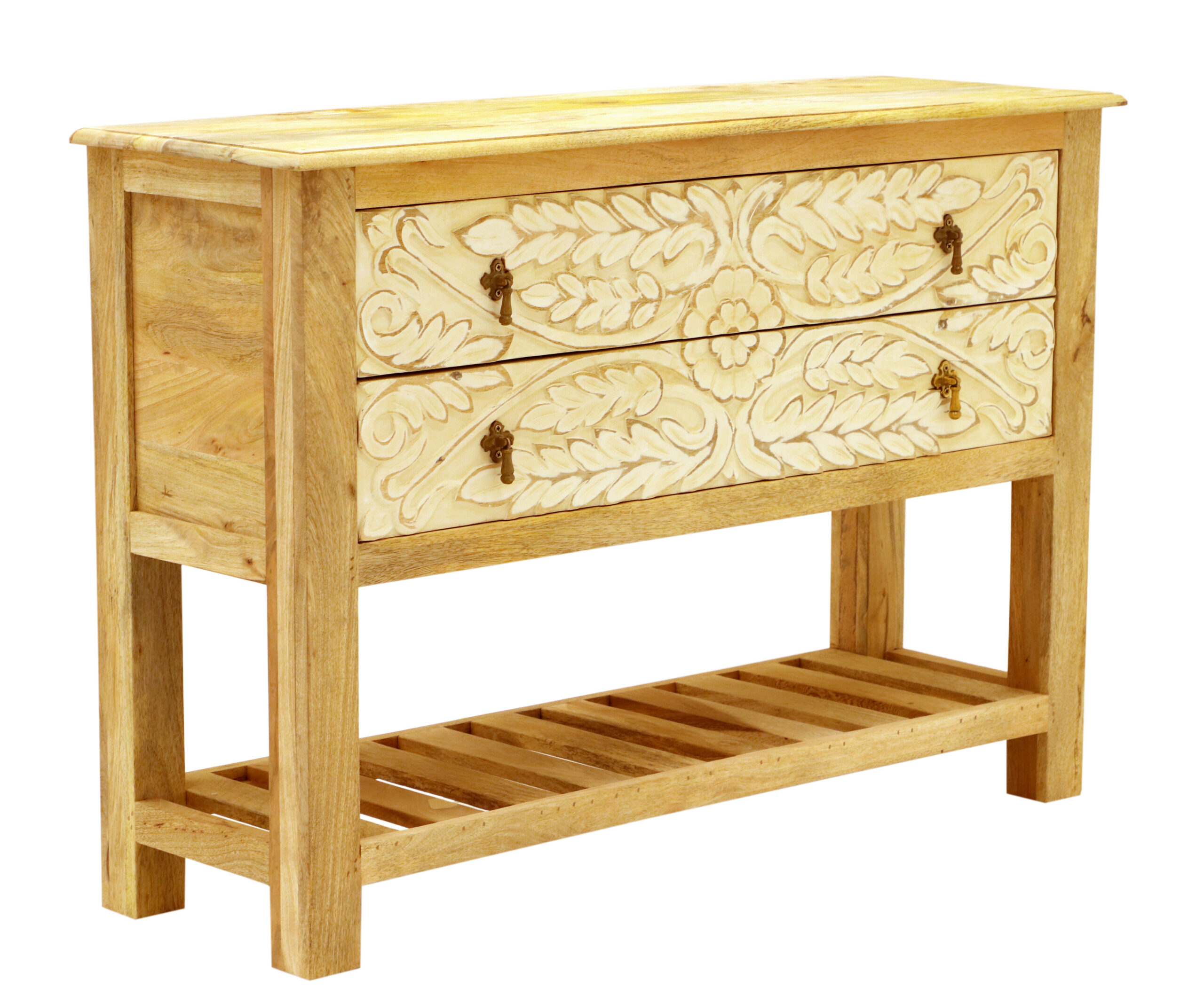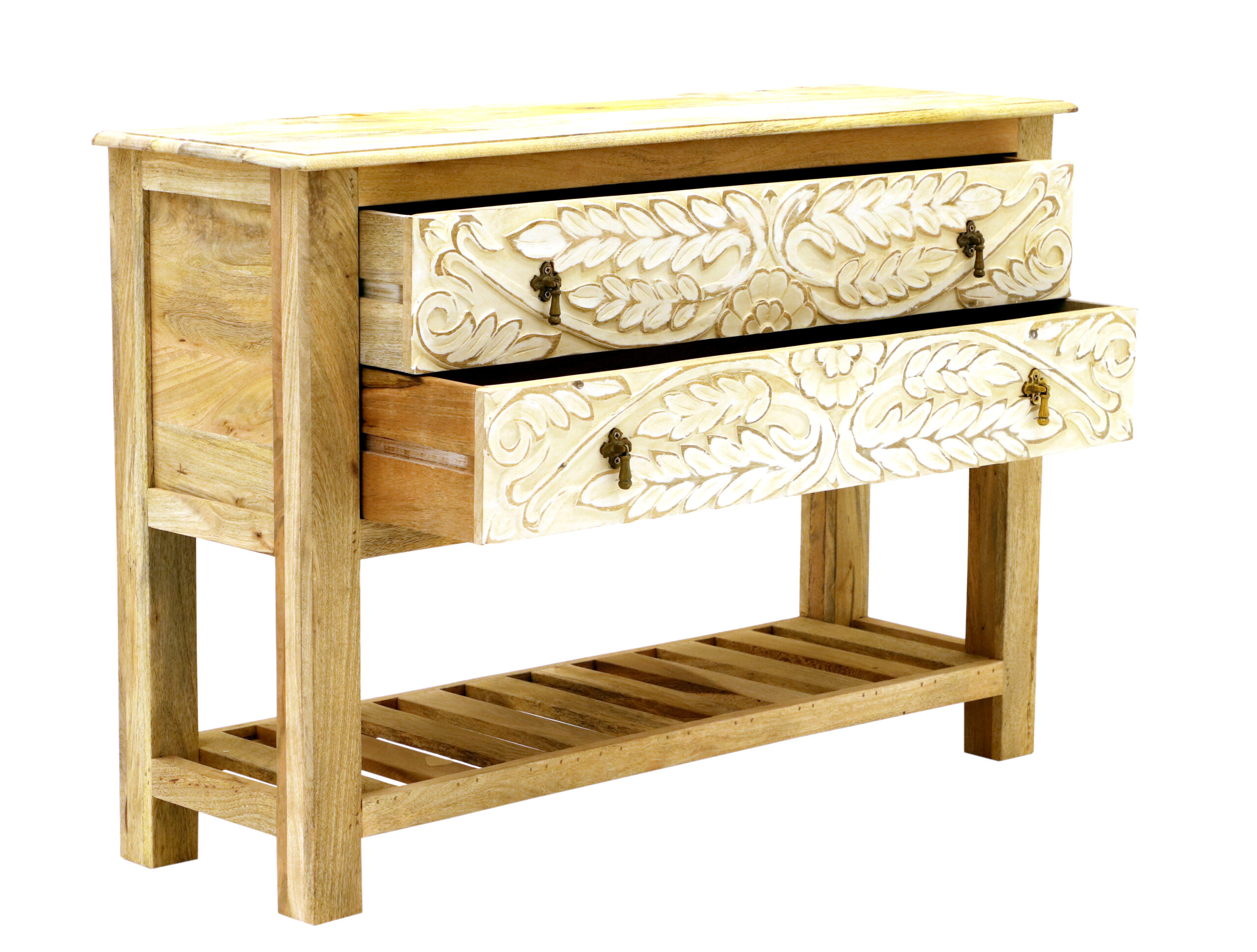 A handcrafted console table made from 100% solid Indian mango wood with a raw, lacquer-free finish. Boho-style crafted, this piece features spacious drawers and a bottom shelf—ideal for a hallway, entryway, or as a chic vanity accent. preserves the natural appearance and feel of wood.