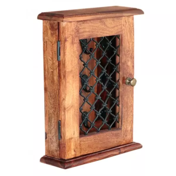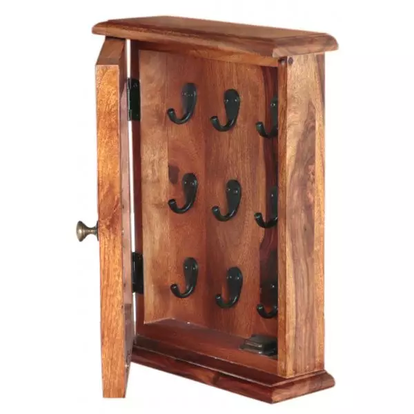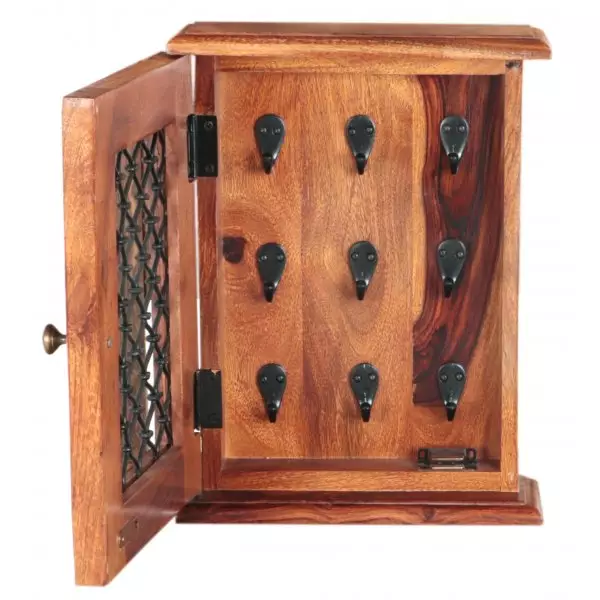 Made entirely of solid (Sheesham) wood, the exquisitely designed JALI-S key cabinet will add style and organization to your hallway. This robust cabinet, which measures 30 cm by 10 cm by 40 cm, serves as both a decorative and practical piece of furniture. It is perfect for everyday organization because it has nine internal hooks for keys.