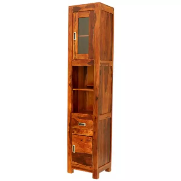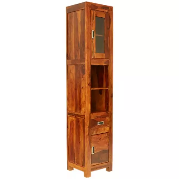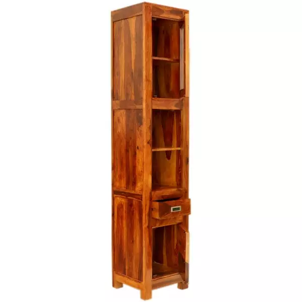 The NELA-SV 40 × 190 × 35 cm cabinet is made entirely of Indian (sheesham) wood, which is renowned for its exceptional grain detail, warm tone, and durability. The product specs is 40 cm wide, 190 cm high, and 35 cm deep.