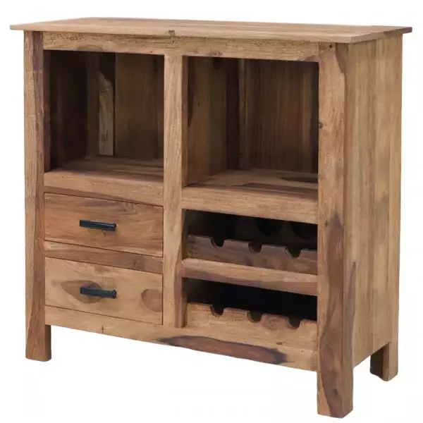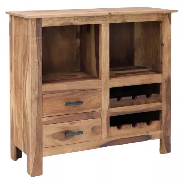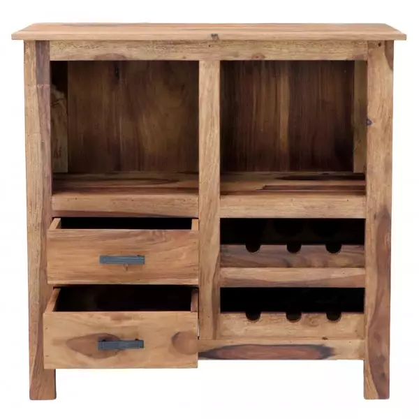 Made entirely of solid (Sheesham) wood, the RAMI-BAR is a stylish and practical bar cabinet. It offers a small yet elegant way to store your drinks, glasses, and bar utensils. Its measurements are 90 cm in width, 35 cm in depth, and 90 cm in height.