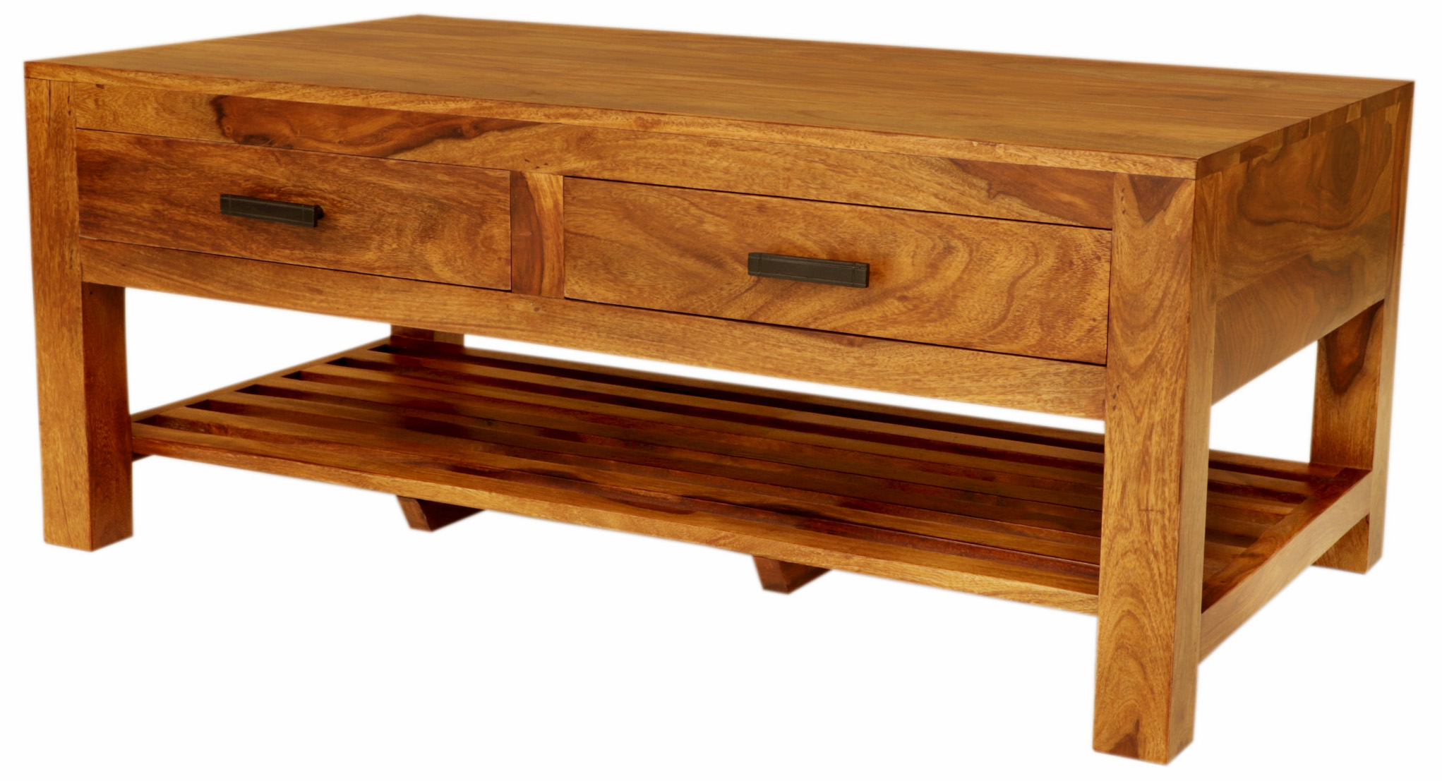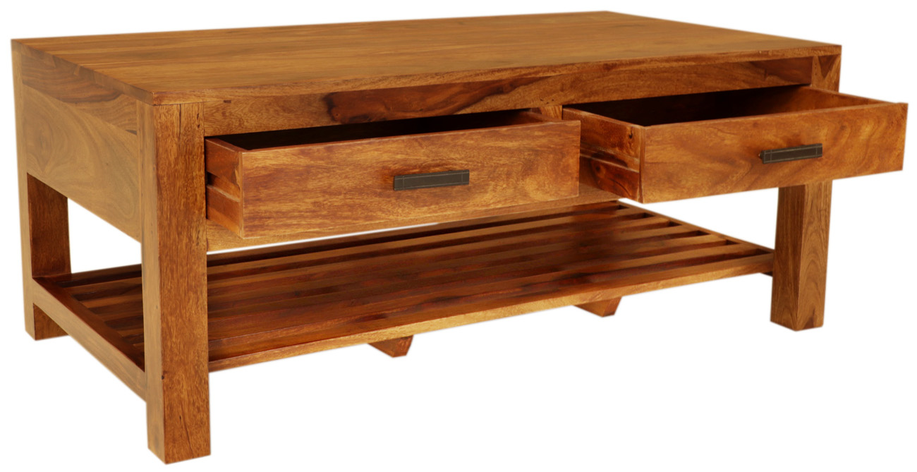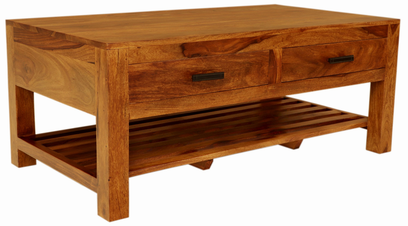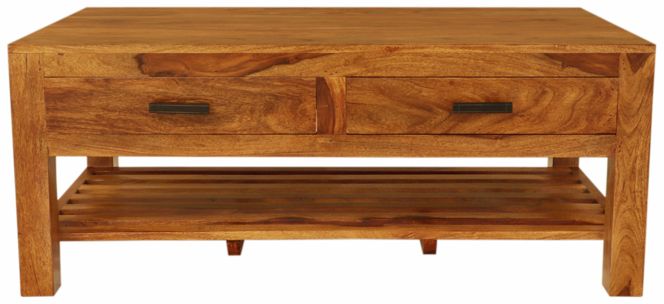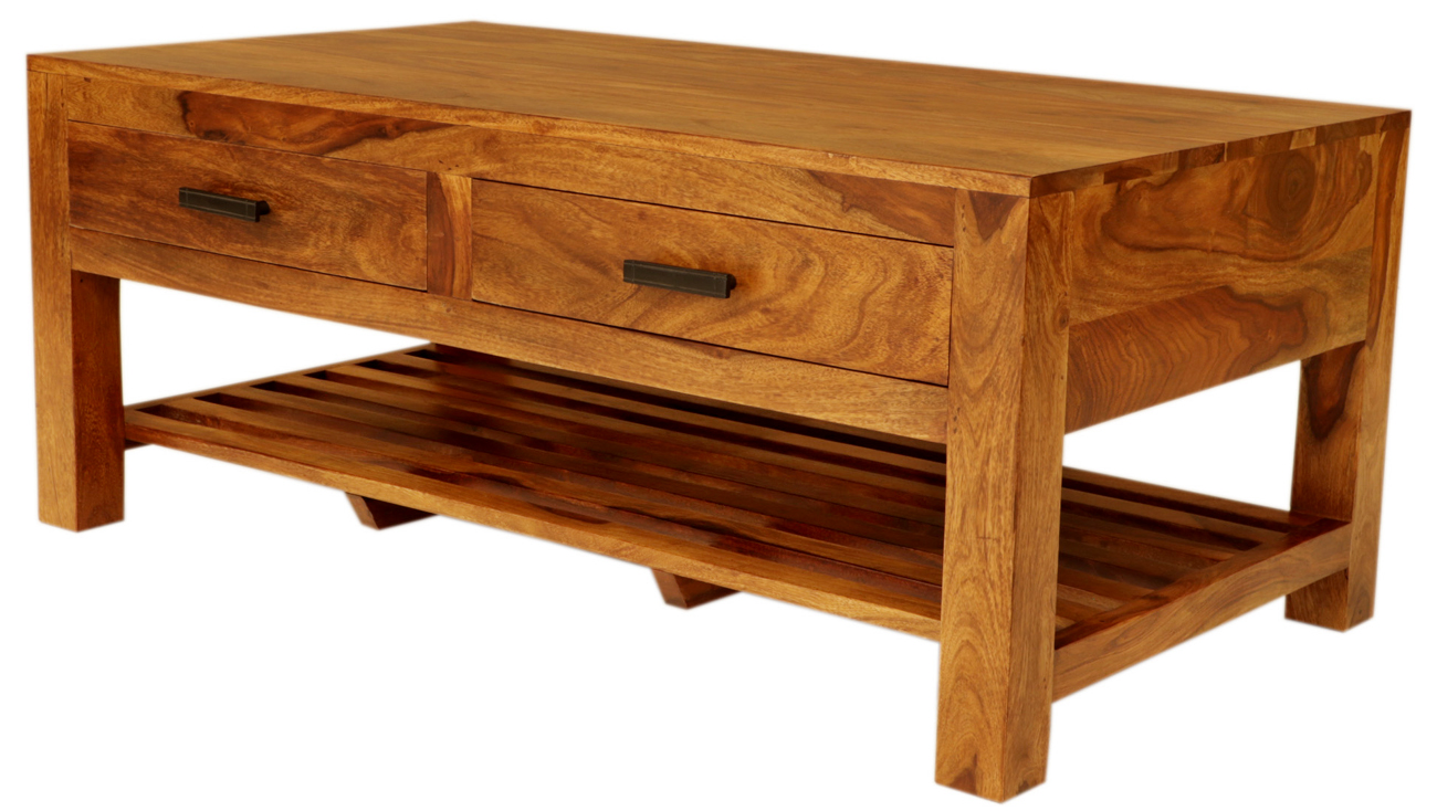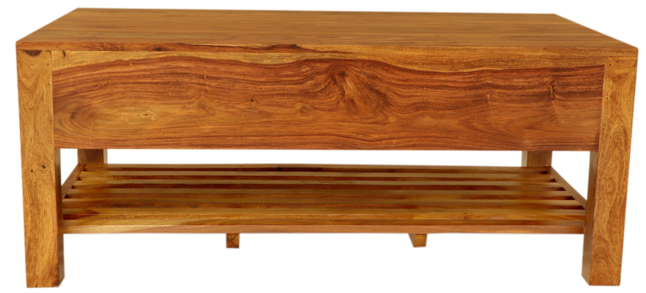 A handcrafted solid wood coffee table made from Indian (sheesham), featuring a “natural” finish, with generous dimensions and durable construction.