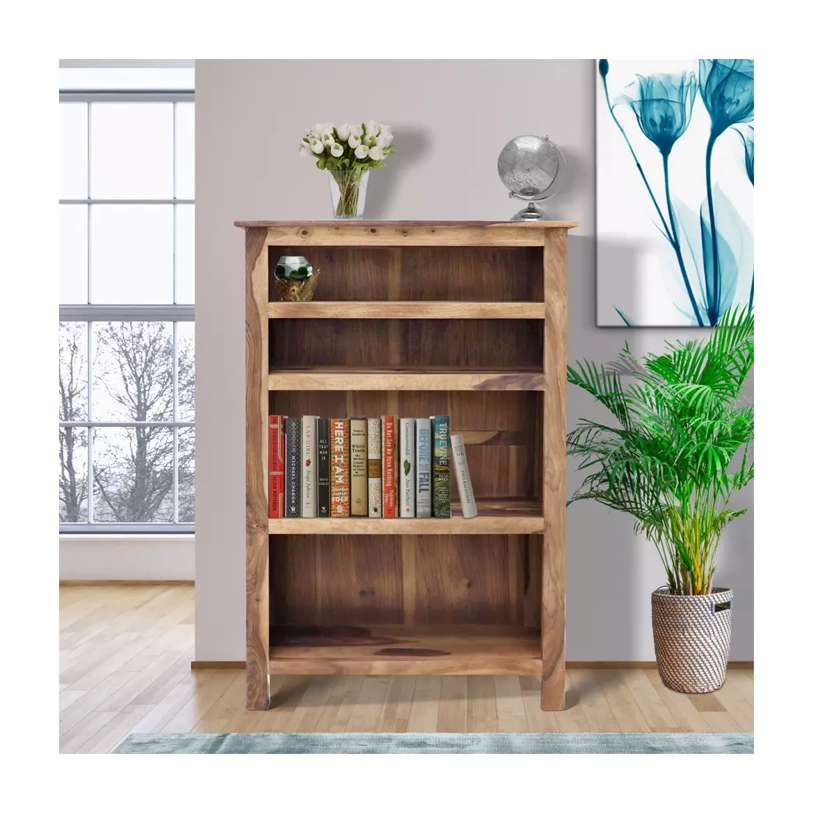 Four open shelves offer flexible display and storage space for books, novels, photo frames, potted plants, decorative showpieces, and everyday essentials. The open design keeps everything accessible while letting the rich natural grain of the Sheesham wood take centre stage in your room.