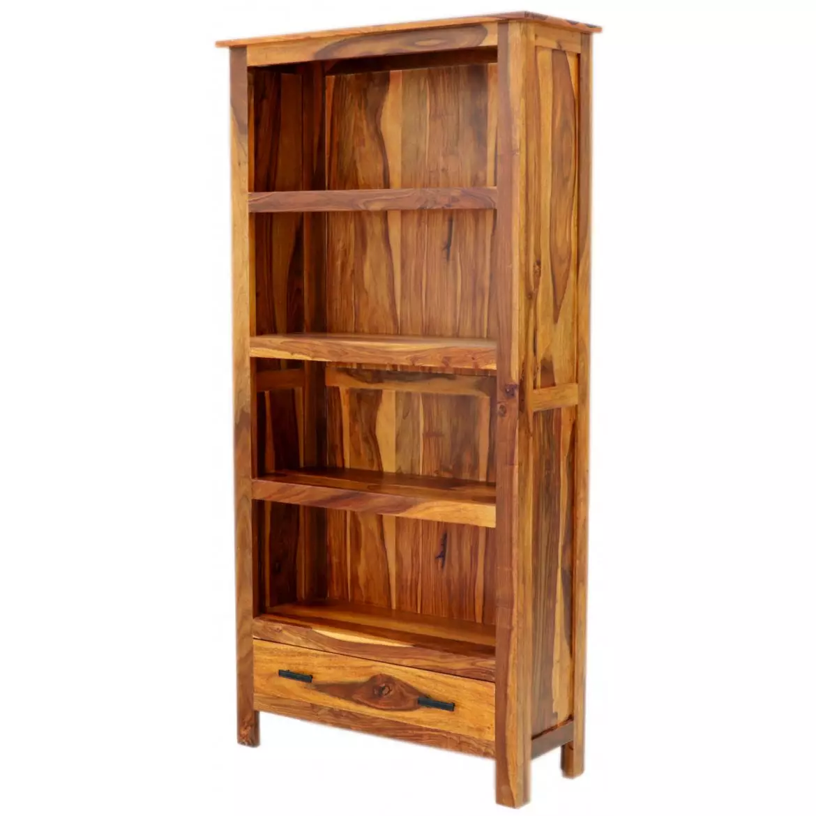 A full-height solid Sheesham wood bookcase combining open shelf display with a large concealed drawer — beautifully handcrafted, built to last generations, and available in Natural and Walnut finishes for every Indian home style.