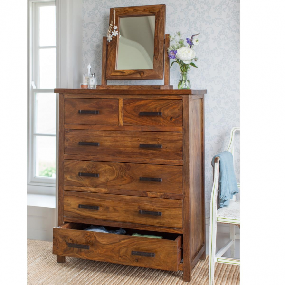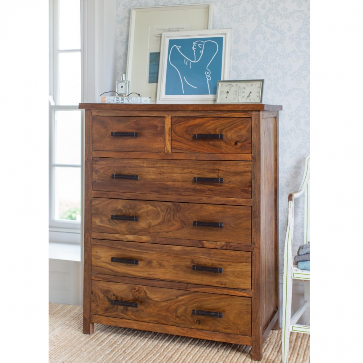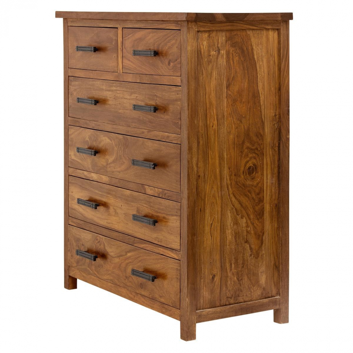 The Rami Solid Wood Tall Chest of Drawers is a commanding bedroom storage piece, handcrafted entirely from 100% Sheesham hardwood. Standing 120 cm tall with a 90 cm width and a deep 45 cm profile, it is the most generous clothing and bedroom storage unit in the entire Rami collection.